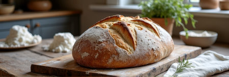 A beautifully baked loaf of rustic bread resting on a wooden table, surrounded by natural elements. Perfect for food photography, home cooking themes, and warm kitchen ambiance.