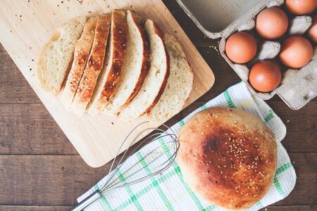 Sliced and loaf of homemade bread with fresh eggs on wooden background, flat lay, top view