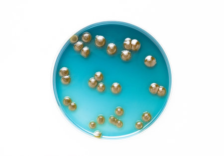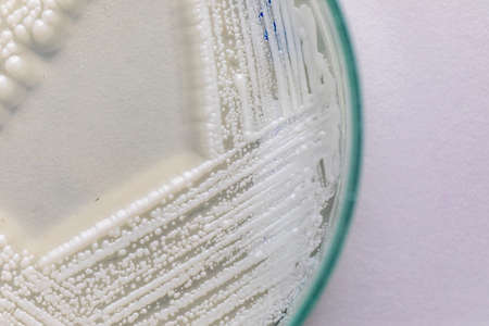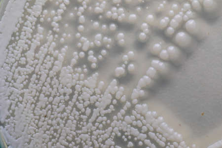 Bacteria grown from skin smear, colonies of Micrococcus luteus and Staphylococcus epidermidis on Petri dish with Tryptic soy agar, close-up view