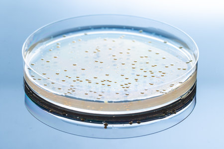 Bright yellow microbial colonies proliferate in a sterile petri dish, illuminated by laboratory lighting, highlighting microbiological growth on a cle