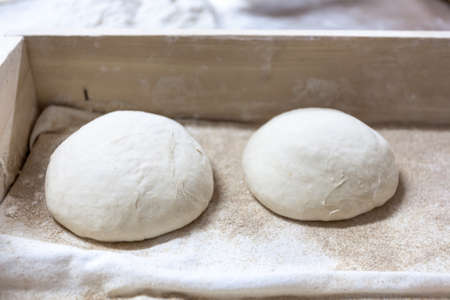 Dough stands on thaw in airtight cabinet, ripening and raising mold for production and baking of hot bread and baguette