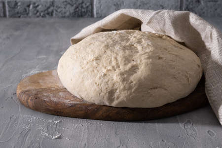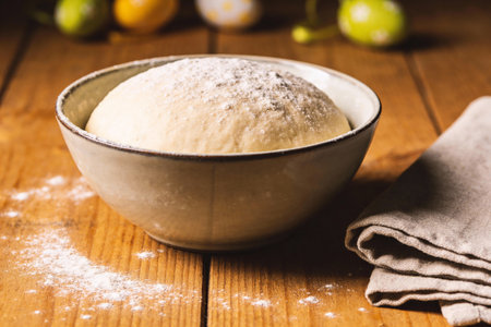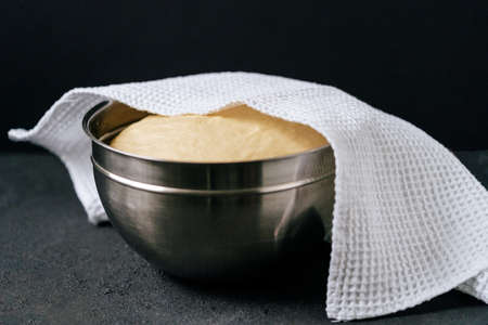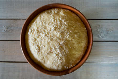 Homemade yeast fresh raw dough in bowl ready to bake.