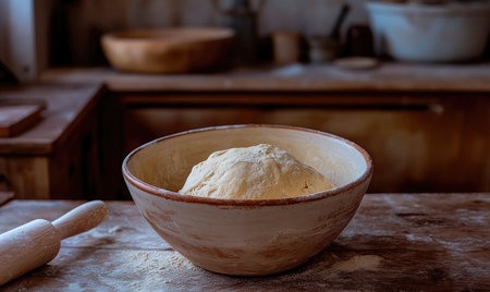 A close-up view of freshly kneaded dough resting in a mixing bowl, set against a rustic wooden table. The scene evokes a warm, inviting atmosphere suitable for baking enthusiasts.