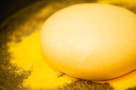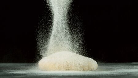 Close-up of dough and flour on a black background. Preparation for pies and rolls. Home baking, cooking.