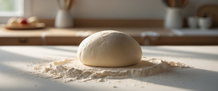 AI Generated. Dough ball resting on a floured surface ready for rolling in a cozy kitchen setting