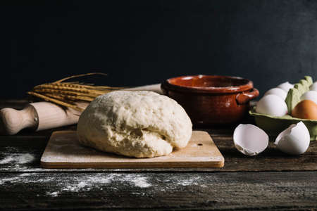 the dough is on the table, white chicken eggs, milk and a wheat ear