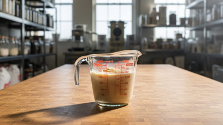 A CINEMATIC WIDE SHOT (16:9) capturing a clear glass measuring cup full of thick, wet pancake batter