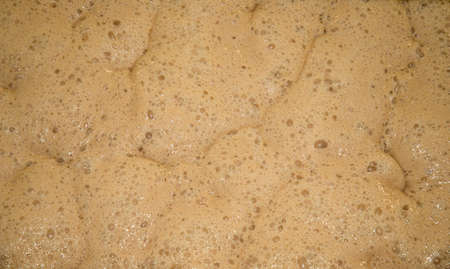 Close-up of craft beer and foam in a fermentation container. Process of making home beer from malt. Craft beer from barley and dark malt.