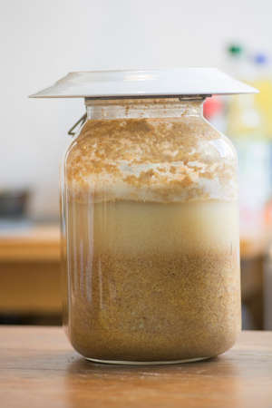 The process of fermentation of homemade sourdough bread. Wholegrain starter for bread.