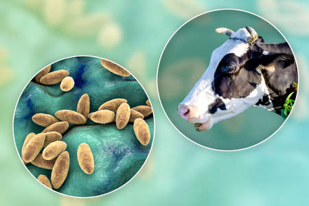 Brucellosis. 3D illustration of bacteria Brucella and photo of a cow. Brucella bacteria are transmitted to human from cattle and other animals by direct contact with ill animal or by contaminated milk
