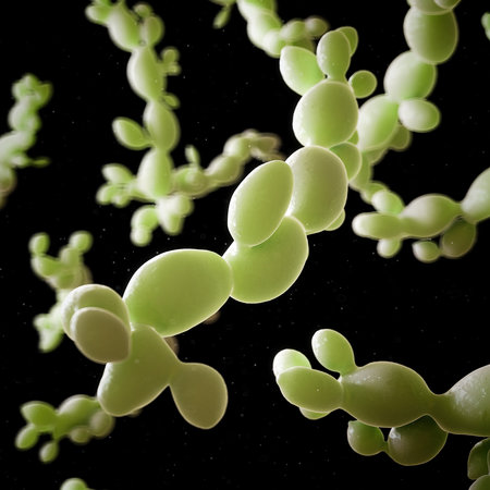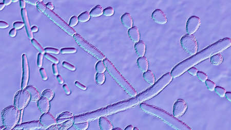 Candida tropicalis yeasts, microscopic fungi that cause infections in immunocompromised patients. Scientific 3D illustration showing pseudohyphae and blastoconidia formed singly or in small groups