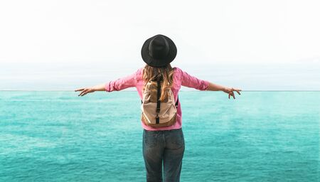 Young woman backpacker exploring new destinations - Back view of travel girl looking the ocean horizon - Tourism and youth people concept
