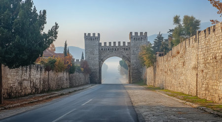 A historic stone archway stands majestically at the entrance to a quaint village. Surrounded by ancient walls, the pathway leads into a foggy atmosphere, creating an enchanting and serene environment at dawn.