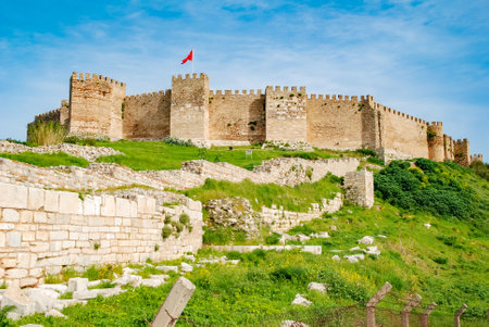 Ayasuluk or Selcuk Fortress in Selcuk, izmir. The fortress from the Byzantine and Ottoman times. view with Turkish flag and vegetation.