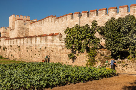 ISTANBUL, TURKEY - SEPTEMBER 19, 2022: Local people growing vegetables next to Theodosian Land Walls in Istanbul, Turkey