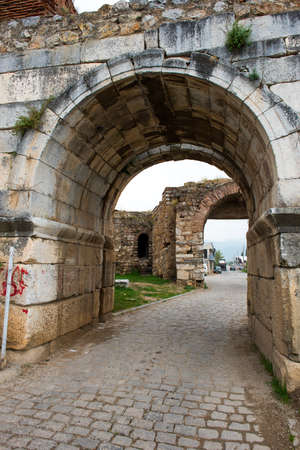 IZNIK, TURKEY - OCTOBER 21, 2018: Yenisehir Gate of ancient Iznik Castle. Historical stone walls and doors of Iznik, Bursa.