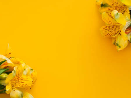 Bright yellow background with border of fresh alstroemeria flowers. Season's greetings card with copy space.