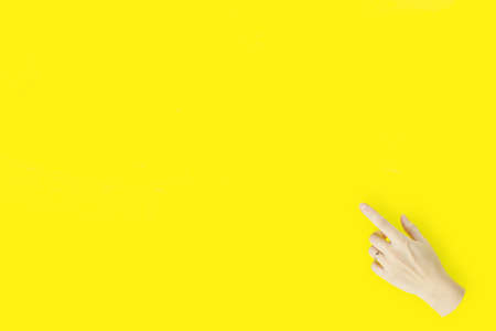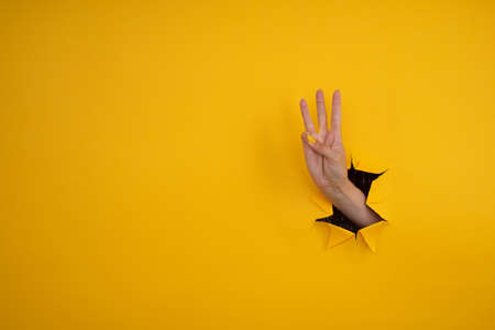 Female hand sticks out of hole in paper, on a yellow background. Three finger sign, copy space.