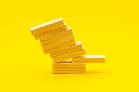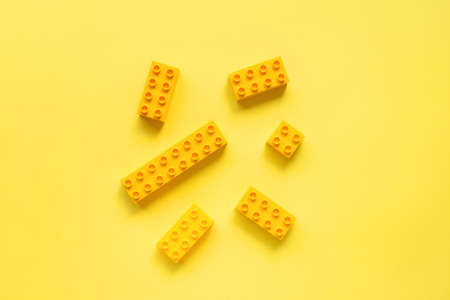 Children's building blocks , yellow blocks on yellow background. Monochrome photo, top view, place text.