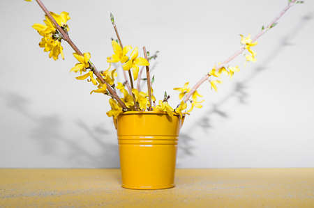 yellow small metal bucket for decoration with a bouquet of spring flowers forsythia with hard shadows on a yellow clean background