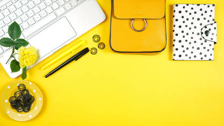 YELLOW desk with computer keyboard, stylish and minimal workspace.
