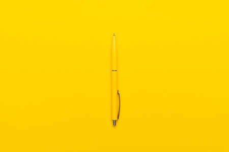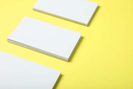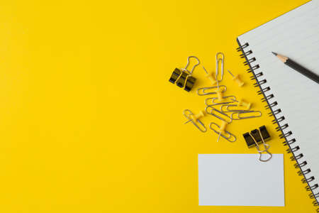 Top view of Notebooks, pens, business card, paper clip on yellow background and copy space