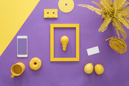 Accessories for the designer's office and workplace in yellow on a purple background. The concept of business and minimalism. Flat lay.