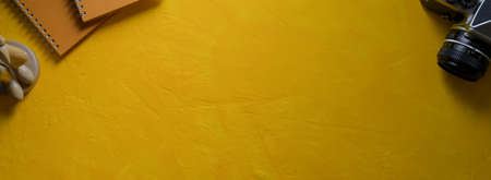 Top view of creative workspace with schedule books, camera and copy space on yellow concrete background