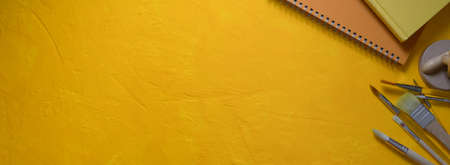 Top view of creative workspace with painting brush, notebooks and copy space on yellow concrete background