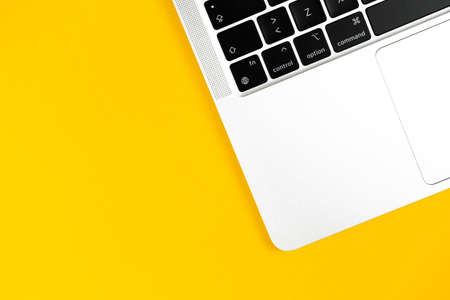 Modern laptop flat lay yellow background. notebook keyboard. Office workplace table, minimal design concept. top view, copy space