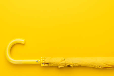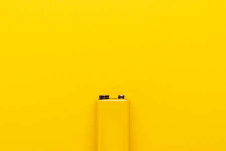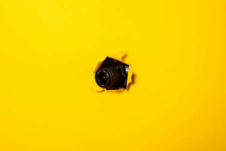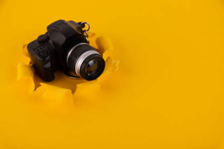 A bright yellow camera on a bright yellow background. Monochrome image of photographic equipment. Flat lay.