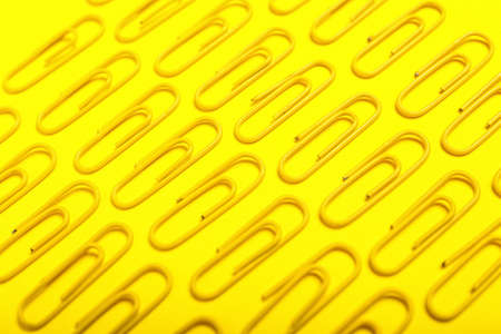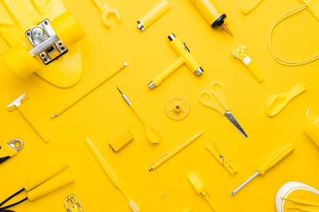 Assorted colorful stationery for school and office on yellow background with copyspace.