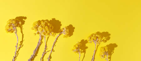 Helichrysum yellow everlasting flowers on yellow background top view copy space. Congratulations for March 8, Mothers Day, Valentines Day, Easter or spring concept.