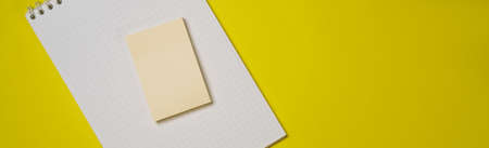Open blank white notepad on a spiral and stickers on a yellow background. Concept of notes for writing in school and business