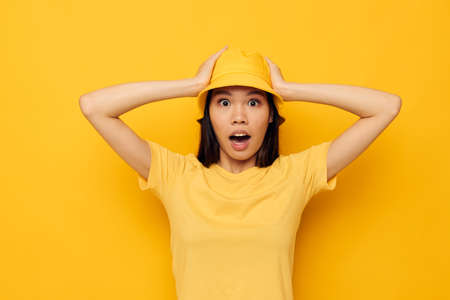 Charming young Asian woman casual wear studio hand gesture isolated background unaltered