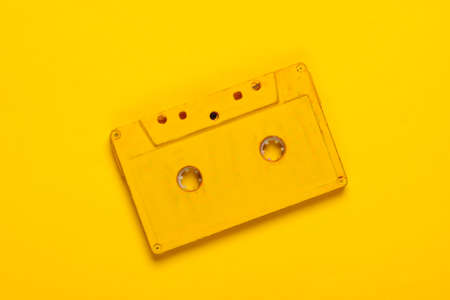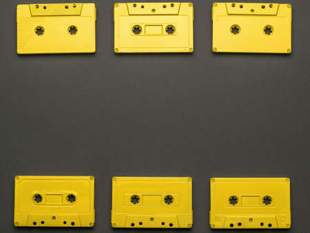 A frame of yellow tape cassettes on a black background. Stylish retro equipment for listening to music. Flat lay.