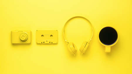 Yellow camera, headphones, cassette tape and a cup of coffee on a yellow background. Color trend. Stylish accessories.