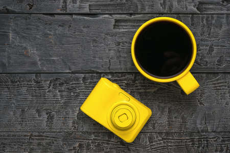 Top view of the camera and a cup of coffee on a wooden table. Creative breakfast. Flat lay.