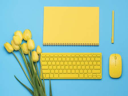 Yellow office workplace accessories and a bouquet of yellow tulips on a blue background. minimal concept. flat lay.