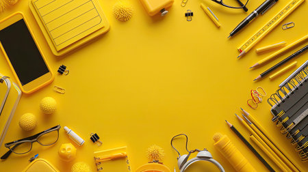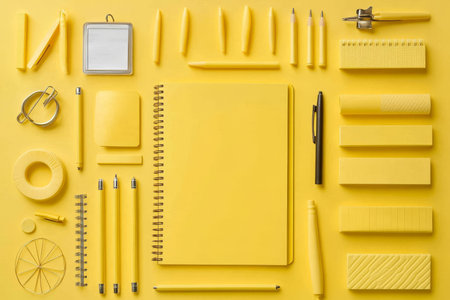 Minimalist composition of yellow notepad surrounded by stationery on matching yellow background
