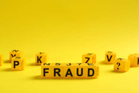 Word Fraud of wooden cubes with letters on yellow background. Space for text