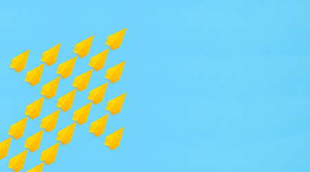 Successful business, innovative and solution concepts. Group of white paper plane in one direction and one red paper plane pointing in different way on blue background
