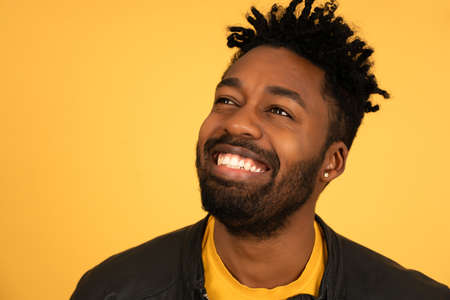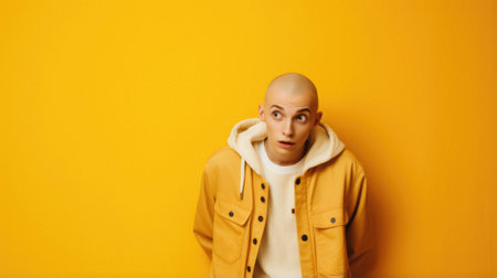 Fat man smiling in yellow t-shirt on yellow background isolated AI