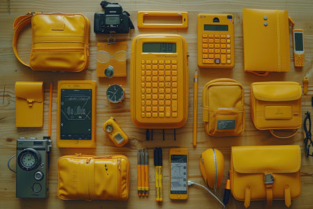 A flat lay featuring yellow leather goods, electronic devices, and writing instruments arranged on a wooden surface.