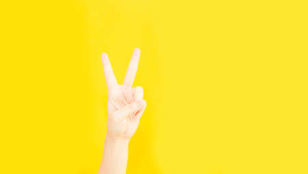 Woman's Hand gesture with V sign for victory or peace on yellow background