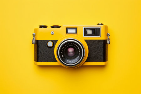 Retro camera isolated on yellow background, close up and top view. AI generated.