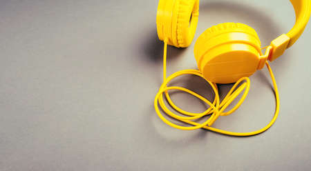 Yellow headphones and skateboard or pennyboard on yellow background. Music concept.