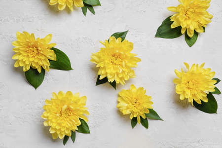 Beautiful yellow chrysanthemum flowers on light background, closeup