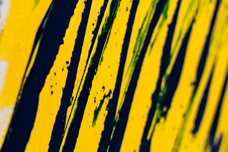 Abstract design created with diagonal brushstrokes of yellow and black paint. The paint appears thick and layered, creating a textured surface.