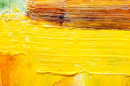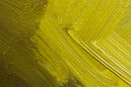 Abstract background with brown and yellow oil paint on canvas. Close-up of brushstrokes in the painting. Olive, ocher, lemon yellow paint. Handmade background design with canvas texture. Oil painting